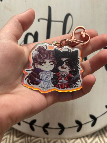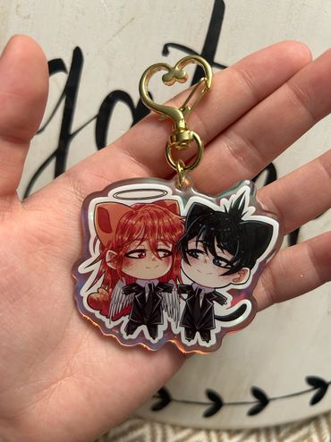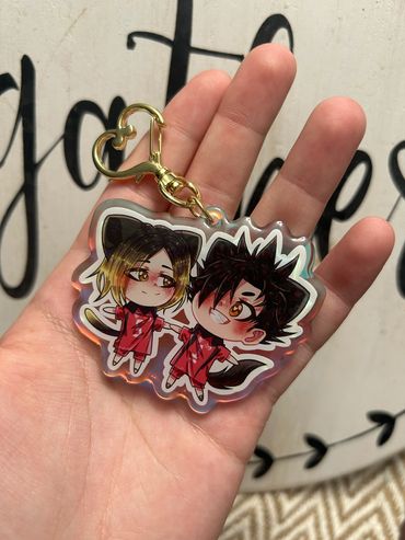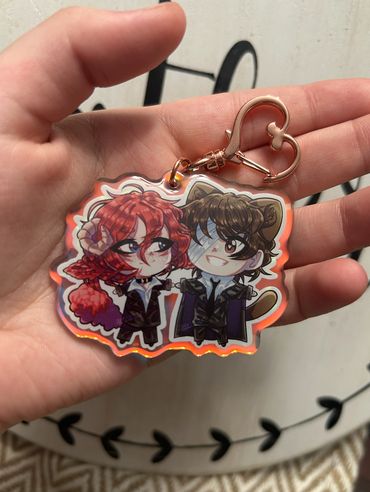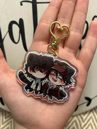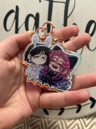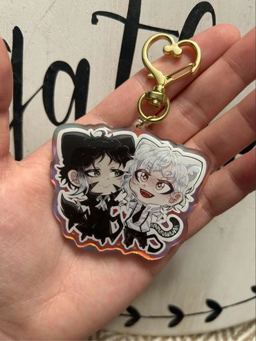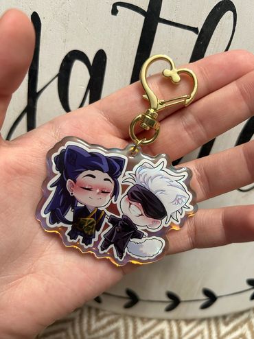 I sell high quality rainbow holographic ship/duos charms from all sorts of different anime fandoms! I focus mainly on LGBTQ+ merch and products, as my favorite part about anime is the different ships and character duos! Those are my best sellers. I also sell individual character based silly guy charms that are small in size! Those also range from all sorts of different shows. Additionally, I sell holographic heart buttons and plush buttons of even more characters! My prints mostly include more ships as well. My fandoms range from Jujutsu Kaisen, Bungou Stray Dogs, Alien Stage, Ouran High School Host Club, SK8, and much, much more! I pride myself on trying to have a wide variety of different fandoms, niche or not, to choose from!